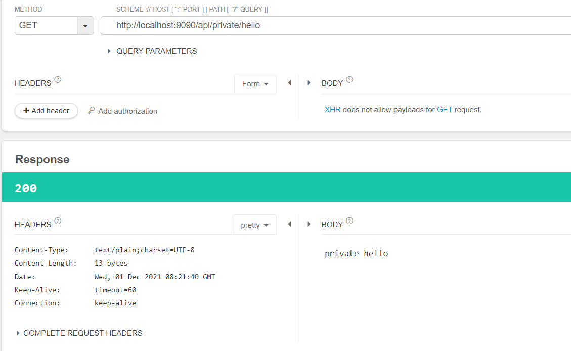 AuthInterceptor class에서 파생된 객체를 받아 addInterceptor()로 interceptor 등록을 할 수 있도록 했다. interceptor 등록을 하지 않으면 private과 public에서 세션 검사 없이 같은 결과를 호출할 것이다. 이제 실행하면 오버라이딩한 preHandle에 걸리면서 interceptor에 걸린 결과를 보여줄 것이다.